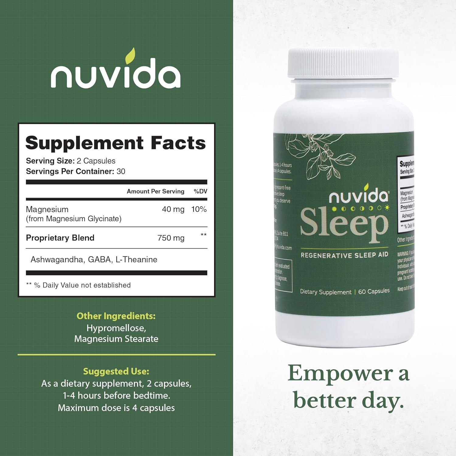 - Dosage is everything: The standard dose of NuVida Sleep is 2 capsules. However, everyone is different, with some people needing more and others needing less. Feel free to adjust the dosage from 1-4 capsules as needed, depending on your experience with NuVida Sleep.